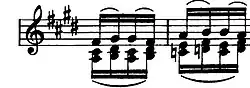 In the middle section (poco più animato), characterized by rhythmic shifts and sudden harmonic turns, theme and accompaniment are fused into oscillating double notes. There are five eight-bar phrases. Leichtentritt observes that each eight-bar phrase is "ruled by a new motif" and that "each of these segments surpasses the preceding one in sonority and brilliancy".[11] The third period, although it stays chromatically centered around E major, is a long sequence of diminished seventh and tritone intervals, littered with accidentals and irregular rhythms difficult to play. It reaches a climax in the fourth period (bars 46–53), a bravura passage of double sixths for both hands. The fifth period (bars 54–61), leading back to the final restatement of the theme, can be described as an extended dominant seventh. Leichtentritt believes it to be "one of the most exquisite sound impressions ever contrived for the piano".[12] Its effect is "based on its contrast with the fourth period and on the gradation of the most tender nuances in piano". The final A section is a quite literal though shortened restatement of the first one. At the end of the étude the fair copy autograph contains the directive attacca il presto con fuoco which means that Chopin foresaw the joint performance of both this étude and the following one.[13]