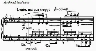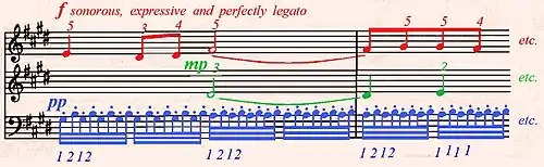 Preparatory exercises consist of addressing two "distinct muscular areas" of the hand by playing two voices with one hand, each voice with a "different intensity in tone". Cortot believes that the "weight of the hand" should lean towards the fingers playing the predominant part while the others "remain limp". He recommends practicing the right-hand part of the first twenty bars (the A section) in three distinct modes of articulation and dynamics simultaneously, the top voice forte and legato, the middle one mp, and the lowest semiquavers in pp and staccato. Concerning the legato Cortot states that the intensity of tone is imparted "by pressure and not by attack". He further observes that legato of notes played in succession by the same finger can only be achieved by the portamento device".[21] His exercises for the double notes of the middle section stress "firm position of the hand" and "vigour of attack". In regard to the pedal Cortot recommends pedal changes synchronized with the bass line (six changes per bar), although many critics say this is too much to be necessary. No pedal indication by Chopin is found in manuscripts or original editions.[22]