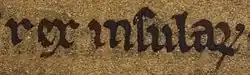 ![]() Óláfr's name and title as it appears on folio 35v. of British Library Cotton Julius A VII (the Chronicle of Mann): "Olavus rex".[1] | |
