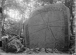 The runic text on Ög 77 states that the stone was raised by a woman named either Tunna or Tonna in memory of her husband Þorfastr, who is described using the word óníðingr. Óníðingr, which with the ó- prefix means the opposite of the Old Norse pejorative word níðingr, was used to describe a man as being virtuous. Óníðingr is used as a descriptive word in some runic inscriptions and is translated in the Rundata database as "unvillainous." It is used as a descriptive term on inscriptions Sö 189 in Åkerby, Sm 5 in Transjö, Sm 37 in Rörbro, Sm 147 in Vasta Ed, and DR 68 in Århus, and appears as a name or part of a name on inscriptions Ög 217 in Oppeby, Sm 2 in Aringsås, and Sm 131 in Hjortholmen.[2] The text on Ög 77, Sm 5, and Sm 37 use the same exact phrase, manna mæstr oniðingʀ or "most unvillainous of men" to describe the deceased,[2] and DR 68 uses a variant of this phrase.[3]