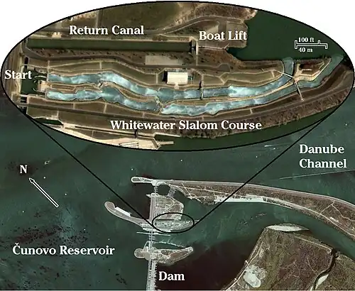 The Čunovo Water Sports Centre is an artificial whitewater slalom course in Slovakia, on an island in the Danube river, 14 km southeast of Bratislava, near the village of Čunovo. It is powered by flow diversion from the Čunovo dam. Since 1997, it has hosted a full schedule of local, regional, and international competitions, including multiple World Cup races, 2 European Championships and the 2011 World Championships.