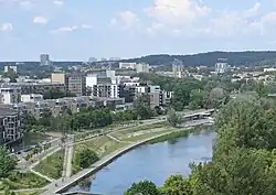 Žirmūnai's southernmost section, which lies on the bank of the River Neris opposite the Vilnius Castle Complex, was part of the settlement known as Žvejai; another part of that settlement is now located within the elderate of Šnipiškės. According to archaeological surveys from 2005, a fishing village may have been located here as early as the late 14th century, giving the area its name, literally, Fishermen; it was later settled by craftsmen and housed the Orthodox Church of St Barbara.[2] During the 16th century, the only glass factory in the Grand Duchy of Lithuania was located in the suburb of Žvejai.[14] In 1563, after the construction of the first bridge over the River Neris (at the approximate location of today's Mindaugas Bridge), the suburb of Žvejai became an integral part of the city of Vilnius.[14] During Tsarist rule in the 19th century, the name of Žvejai was superseded by that of Piramont, originating from the small estate of Piramont in the area (now Kalvarijų 1).[15] Piramontskij Alley can be seen in a 1904 map of Vilnius[16] where today's A. Juozapavičiaus Street in the elderate of Šnipiškės is located, close to the boundary of Žirmūnai. The usage of Piramont as a placename gradually became limited to the southern part of Žvejai.