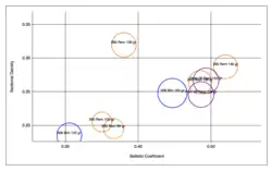 | COR-BON DPX260120T-20 | 120 gr (7.8 g) DPX Hunter Tip | 2,900 ft/s (880 m/s) | 2,241 ft⋅lbf (3,038 J) | 285 yd (261 m)/242 yd (221 m) | Current production |
