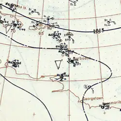 A tropical depression developed about 415 mi (670 km) south-southwest of Paramaribo, Suriname, on August 18. The system moved just north of due west throughout its duration and deepened into a tropical storm about 24 hours later. On August 20, the cyclone peaked with maximum sustained winds of 50 mph (80 km/h). Late on August 20, the storm passed through the Windward Islands just north of Grenada.[4] According to Governor-in-Chief of the Windward Islands Robert Baxter Llewelyn, no damage occurred on Grenada. At Barbados, three lighters and a schooner, the Myosettis, were wrecked. The jetties and vessels at them were destroyed on Saint Vincent.[6] After reaching the Caribbean, the cyclone began weakening, probably due to colder sea surface temperatures and the storm's proximity to South America.[14] On August 21, the cyclone weakened to a tropical depression. Continuing westward, it dissipated at 18:00 UTC on the following day while situated about 65 mi (105 km) west-northwest of Aruba.[4]