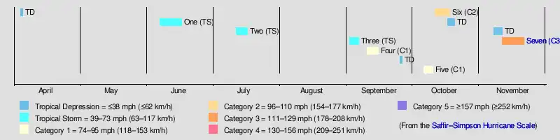 In addition to the seven tropical storms, four tropical depressions developed and remained below tropical storm intensity. The first formed from an extratropical cyclone well to the southwest of the Azores on April 4. The depression moved southwestward until being by a frontal boundary on April 6. By September 25, another tropical depression developed from a formerly extratropical cyclone about halfway between Bermuda and the Azores. However, on September 27, the depression lost tropical characteristics again. The next tropical depression formed on October 17 to the southeast of Bermuda. Moving generally northwestward, the depression transitioned into an extratropical cyclone by October 21. The final non-developing depression formed from an extratropical cyclone to the west of the Canary Islands on November 7. The depression tracked generally westward before being absorbed by a frontal system on November 11.[4]