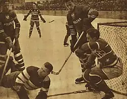 By winning its first world championship, the United States deprived Canada of the world title for the first time in tournament history. The American team, the Massachusetts Rangers, was mostly made up of university students and led by standout performances of Gerry Cosby in goal and team captain Ben Langmaid on defence. Canada was represented by the Toronto National Sea Fleas, winners of the 1932 Allan Cup, and coached by the controversial hockey personality Harold Ballard.[1] The teams met on February 26 at Zimní stadión on Štvanice island. Tied 1-1 after 45 minutes of regulation time on goals by Sherman Forbes for the United States and an equalizer by Canadian Tim Kerr, defenceman John Garrison beat Canadian goalie Ron Geddes at the 6-minute mark of a dramatic "non-sudden death" overtime period.