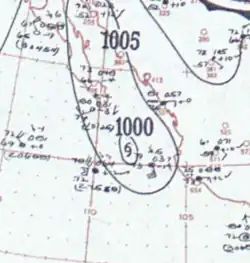 Ships reports from the Hawaiian Islands to Panama indicated that an area of disturbed weather formed just west of the Revillagigedo island group. Initially, evidence of closed wind circulation was insufficient to warrant an upgrade into a tropical disturbance. By the afternoon, pressures in the region began to fall. By that night, it was estimated to have developed winds of 40 mph (65 km/h).[3] A tropical storm formed on September 9;[6] meanwhile, ship reports indicated a pressure of 1,001 mbar (29.6 inHg) and sustained winds of 50 mph (85 km/h).[3] Maintaining peak intensity for a day, the low moved northwest before dissipating on September 10 as[6] barometric pressures began to rise. The remnants of the storm later brought rain to Central California on September 15.[3]