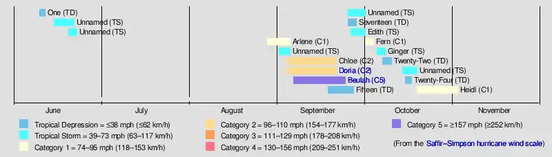 The season got off to a slow start, with the first operationally named storm, Arlene, not forming until August 28. The latency was caused by a stronger than normal ridge across the Atlantic Ocean, which suppressed convective activity across the basin and prevented the formation of strong low pressure areas.[4] The season came to life in September, as seven tropical storms formed, including hurricanes Beulah, Chloe, and Doria.[3] The season's overall activity was reflected with an above normal Accumulated Cyclone Energy (ACE) index of 121.7 units. ACE is, broadly speaking, a measure of the power of the hurricane multiplied by the length of time it existed, so storms that last a long time, as well as particularly strong hurricanes, such as Beulah, have high ACEs. It is only calculated for full advisories on tropical systems at or exceeding 39 mph (63 km/h), which is the threshold for tropical storm status.