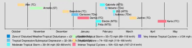 The first storm was Tropical Cyclone Alex, which was named by the Australian Bureau of Meteorology (BoM). this was due to the boundary of the basin at the time, which incorporated the Indian Ocean south of the equator and extended from the east coast of Africa to 80° E; the eastern extent was later moved to 90° E. Two other storms – Armelle and Damia – also originated in the Australian basin. The latter was the strongest cyclone on record in the basin at the time by barometric pressure, estimated at 898 mbar (26.52 inHg). The first storm to affect Madagascar was Benedicte in December, and was followed by tropical storms Frida and Electre in February and Justine in March. The final storm of the season was Cyclone Karla, which remained in the eastern periphery of the basin while reaching winds of 170 km/h (105 mph).