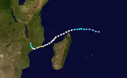 There were three short-lived tropical depressions toward the end of February. The first formed on February 19 about 350 km (220 mi) northeast of Tromelin Island. It moved southward toward Mauritius, bringing several days of heavy rainfall there and Réunion. The depression turned to the west-northwest and dissipated on February 23.[29] That day, the other two depressions formed, including one between Réunion and Madagascar. Given the name Isabeau, it moved westward and dissipated on February 24, reaching winds of only 50 km/h (30 mph).[29][30] The other depression originated in the Mozambique Channel off the southwest coast of Madagascar. On February 24, the system passed south of the island while moving southeastward, bringing wind gusts of 79 km/h (49 mph) at Tôlanaro. It gradually became extratropical, dissipating within the westerlies on February 26.[29] The JTWC classified the system as Tropical Cyclone 20S, estimating 1 minute winds of 85 km/h (55 mph),[31] although it was only officially classified as a tropical depression.[29]