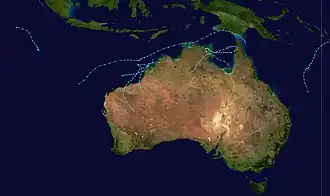 Kay 19–26 April Category 2 tropical cyclone 100 km/h (60 mph) 975 hPa (28.79 inHg) Queensland, Papua New Guinea, Northern Territory, Western Australia