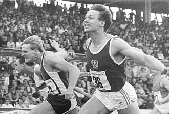 ![]() Sprinter Sven Matthes (right) winning the men's 100 metres | |
