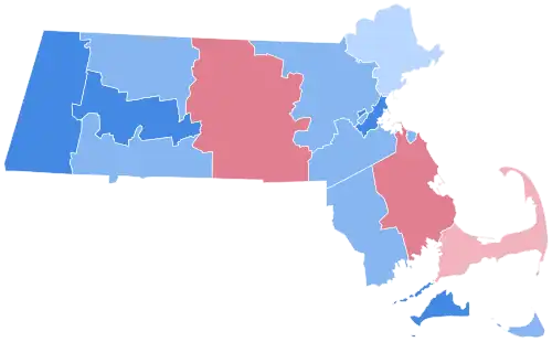 As of 2024, this was the last time that the cities of Amesbury, Attleboro, Beverly, Braintree, Brockton, Franklin, Leominster, Marlborough, and Methuen and the towns of Abington, Alford, Auburn, Avon, Ayer, Barnstable, Bedford, Bernardston, Bolton, Boxborough, Buckland, Burlington, Canton, Carlisle, Charlemont, Chelmsford, Clinton, Cummington, Danvers, Dedham, Dennis, Erving, Essex Gosnold, Grafton, Groton, Hancock, Harvard, Harwich, Hawley, Holbrook, Holliston, Hopedale, Hudson, Ipswich, Littleton, Longmeadow, Manchester-by-the-Sea, Mansfield, Marblehead, Marion, Mattapoisett, Medway, Milton, Mount Washington, Needham, New Ashford, New Salem, Newbury, Northborough, Norton, Peru, Petersham, Plymouth, Reading, Savoy, Sheffield, Shelburne, Shirley, Shrewsbury, Southborough, Southampton, Stow, Sudbury, Wakefield, Wellesley, West Newbury, Westborough, Westford, Westhampton, Weston, Winchester, Windsor, and Yarmouth voted Republican.