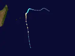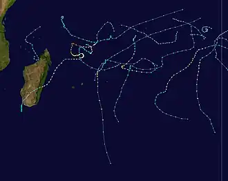 During the season, the Météo-France office (MFR) on Réunion island issued warnings in tropical cyclones within the basin. Using satellite imagery from National Oceanic and Atmospheric Administration, the agency estimated intensity through the Dvorak technique, and warned on tropical cyclones in the region from the coast of Africa to 90° E, south of the equator.[1] The Joint Typhoon Warning Center (JTWC), which is a joint United States Navy – United States Air Force task force, also issued tropical cyclone warnings for the southwestern Indian Ocean.[2] The season's nine named storms and five tropical cyclones – a storm attaining maximum sustained winds of at least 120 km/h (75 mph) – is the same as the long term average for the basin.[3]