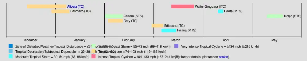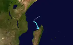 The first named storm of the season, Alibera formed on December 16, well to the northeast of Madagascar. For several days, it meandered southwestward while gradually intensifying. On December 20, Alibera intensified to tropical cyclone status with 10‑minute winds of 120 km/h (75 mph), or the equivalent of a minimal hurricane. That day, the Joint Typhoon Warning Center (JTWC), an unofficial warning agency for the region, estimated peak 1‑minute winds of 250 km/h (160 mph), while the Météo-France office in Réunion (MFR) estimated 10‑minute winds of only 140 km/h (87 mph). After drifting erratically for several days, the storm began a steady southwest motion on December 29 as a greatly weakened system. On January 1, Alibera struck southeastern Madagascar near Mananjary, having re-intensified to just below tropical cyclone status. It weakened over land but again restrengthened upon reaching open waters on January 3. The storm shifted directions while moving generally southward, dissipating on January 5.[2][9] It was the second longest-lasting tropical cyclone in the basin since the start of satellite imagery, with a duration of 22 days. Only Cyclone Georgette in 1968 lasted longer at 24 days.[10]