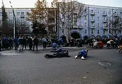 While increasing the blockade around Tbilisi, Tengiz Sigua and Tengiz Kitovani offer a peace proposal to Gamsakhurdia on 24 December. The plan offers to treat members of government with safe conduct in exchange of the immediate resignation of the President, an offer refused by the head of state.[70] At the end of the day, some international reports estimated the number of dead between 23 and 50 Georgians and 168 to 200 injured. Russian television shows footage of civilians evacuating the bodies of victims during the evening.[70] On 25 December, the number of dead grows to 30–80 victims, according to US media.[73]