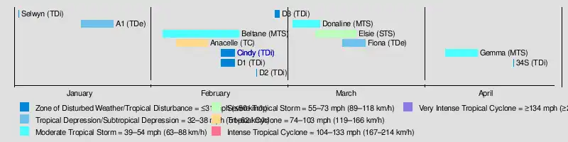 The season had the latest start in 30 years, with the first depression forming in January.[1] The first storm, Anacelle, was not named until February 8, which retains the record for the latest date of the first named storm.[4] For the early portion of the season, there were unusually quiet conditions across much of the basin, along with higher than normal pressure. The Intertropical Convergence Zone (ITCZ) associated with the monsoon only became active in February, allowing tropical cyclogenesis to occur more frequently. There were six tropical storms during the season, of which only one attained tropical cyclone status; these are below the averages of 9 and 4, respectively. No storms attained intense tropical cyclone status. The season's low activity contrasted that of the previous season, which was much more active. There were 18 days in which a storm was active, the lowest since 1982–83. An ongoing El Niño was evident during the season.[1]