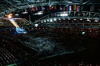 Veteran ceremonies director Ric Birch was the Director of Ceremonies[6] while David Atkins was the Artistic Director and Producer.[7] Its artistic section highlighted several aspects of Australian culture and history, showing Australia's flora and fauna, technology, multiculturalism, and the hopeful moment of reconciliation towards Aboriginal Australians.[6][8] The ceremony had a cast of 12,687 performers,[9] seen by a stadium audience of around 110,000.[8]