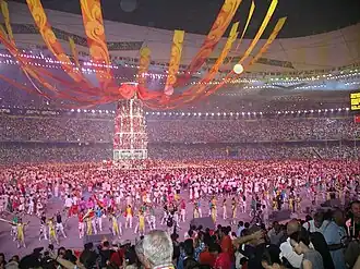 The 2008 Summer Olympics closing ceremony was held at the Beijing National Stadium, also known as the Bird's Nest.[1] The ceremony was directed by Chinese filmmaker Zhang Yimou and began at 20:00 China Standard Time (UTC+8) on Sunday night, 24 August 2008. The number 8 is associated with prosperity and confidence in Chinese culture.[2]