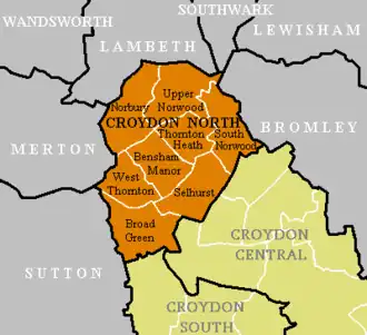 The constituency covers the north west of the London Borough of Croydon and includes Thornton Heath, Norbury, Selhurst and parts of South and Upper Norwood. It is made up of eight electoral wards from the borough: