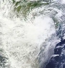 During June 19, an eastward propagation of the Madden–Julian oscillation over the maritime continent, lead to the season's first area of low pressure developing over coastal parts of Bangladesh.[2] This helped the monsoon set in over India's north-eastern states and advance in to central India.[2] During the final week of June the monsoon weakened, which led to the emergence of heatwave conditions over eastern parts of coastal India.[2] The monsoon subsequently started to revive as it interacted with the mid-latitude westerlies and it advanced into parts of the Himalayas and northwest India by July 1.[2] During the first week of July an area of low pressure and several upper air cyclonic circulations caused the monsoon to advance further, where it covered the whole of Haryana, Madhya Pradesh, Punjab and Uttar Pradesh by July 7.[2] Over the next two weeks a trough of low pressure and a cyclonic circulation, helped advance the monsoon into remaining parts of the Arabian Sea, central and north-western India.[2] The India Meteorological Department (IMD) subsequently declared that the monsoon covered the whole of India on July 17, which was about two days later that normal.[2]