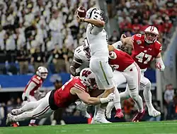 ![]() Western Michigan University quarterback Zach Terrell attempts a pass under pressure against Wisconsin in the 2017 Cotton Bowl Classic. | |