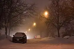 Another storm began on February 11, with some areas in the Midwestern and Northeastern United States expected to receive up to 12 inches (30 cm) of snow in the upcoming days, as well as parts of Ontario and Quebec expected to receive 14 inches (36 cm).[37] In Toronto, all schools were closed on February 12 in anticipation of the storm.[38] The city saw up to 15 cm (6 in) of snow followed by sleet and freezing rain. Ice and snow in Chicago resulted in 70,000 ComEd power outages.[39] The storm's maximum snowfall accumulation was 26.5 inches (67 cm), which fell near Negaunee, Michigan. Ice secretion peaked at half an inch north of Toledo, Ohio.[40]