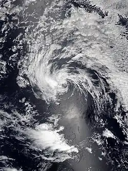 A tropical wave emerged off the west coast of Africa on June 20 and crossed into the East Pacific on July 3, where it interacted with the monsoon trough and began to organize. This system developed a defined surface low on July 6 and was classified as a tropical depression about 435 mi (700 km) south of Acapulco, Guerrero. Steered along a northwest trajectory by a mid-level ridge, the depression traversed a region of favorable conditions which enabled slow intensification.[28] Initial predictions from the NHC suggested significant strengthening of the cyclone.[29] However, Cristina instead encountered cooler waters and eventually drier air; it reached its peak intensity late on July 10 with winds of 70 mph (110 km/h) as it passed west of Socorro Island. Thereafter, the cyclone turned west along the south side of the subtropical ridge and steady weakened. The storm degraded into a remnant low around 18:00 UTC on July 12 and degenerated into a trough on July 15 about halfway between Hawaii and Baja California Sur.[28]