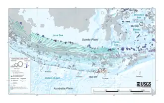 Recordings of earthquakes in West Java began in 1844; earthquakes in 1910, 1912, 1968, 1982 and 2000 damaged many homes. Several people were killed by the earthquake in 1982. In 2000, a magnitude 5.1 shock left about 1,900 homes badly damaged.[7] Although shallow inland earthquakes in Java are infrequent, they result in large casualties. In 1924, two earthquakes situated near Wonosobo killed nearly 800 people. Four other earthquakes in the 20th century on the island also caused between 10 and 100 deaths. Another shallow crustal earthquake centered near Yogyakarta in 2006 left some 5,749 people dead.[8] Shallow crustal faults such as the Cimandiri, Lembang and Baribis faults represent seismic hazards due to their potential for damaging earthquakes.[9]
