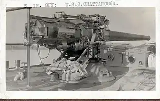 ![]() Chattanooga, 5"/50 caliber deck gun, probably port side forward.  | |