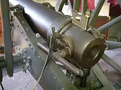 The gun was fired by a Reibschlagröhre, which was inserted above the breech. The Reibschlagröhre was ignited by pulling the line. From 1882 this ignition system was replaced by the Gressly percussion system. With this system an ignition casing was inserted in the lock on the side of the breech. A canal allowed the sparks to reach the powder in the barrel. The recoil of the gun was 10 m. The use of the recoil brake system 'Lemoine' limited this to 4 m.