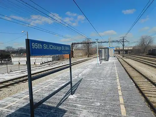 95th Street/Chicago State University is an electrified commuter rail station along Metra Electric's main line on the northeast corner of Chicago State University in Chicago, Illinois. The station is located at 95th Street and Cottage Grove Avenue, and is 12.0 miles (19.3 km) away from the northern terminus at Millennium Station.[2] In Metra's zone-based fare system, 95th Street/Chicago State University is in zone 2. As of 2018, the station is the 224th busiest of Metra's 236 non-downtown stations, with an average of 24 weekday boardings.[1]