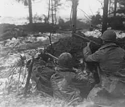 The division first saw action on 9 November, taking over the defense of the sector north of the Roer River between Schmidt and Monschau, a distance of nearly 19 miles.[5] After defensive patrolling, the 99th probed the Siegfried Line against heavy resistance on 13 December. Formerly nicknamed the "Checkerboard Division," which referred to its shoulder patch, in late 1944 having not yet seen battle, the division was nicknamed the "Battle Babies."[1]