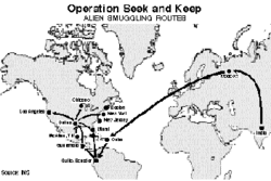 In 1998, the investigation broke an international alien smuggling and money-laundering ring that brought in an estimated 12,000 illegal aliens to the United States at a cost of $20,000 per alien, generating more than $200 million in proceeds over a 3-year period.[5] The organization smuggled aliens who were nationals of India, Afghanistan, Pakistan, and Syria.[6] The operation identified smuggling routes that started in India and went to Moscow, where connecting flights allowed aliens to travel to Latin American or the Caribbean.[7] Aliens would then either fly or travel by boat to the Miami area or walk across the Mexican border.[8][9][10]