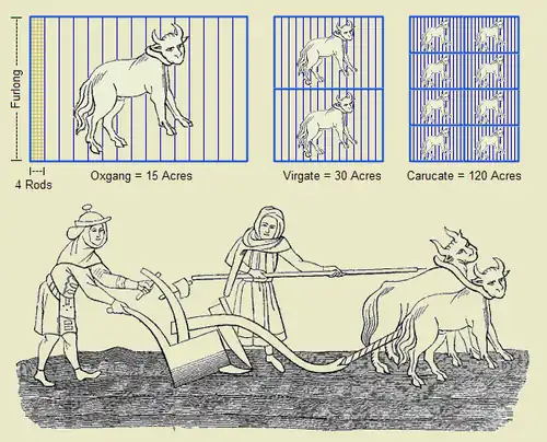 - A carucate was the amount of land tillable by a team of eight oxen in a ploughing season. This was equal to 8 oxgangs or 4 virgates.