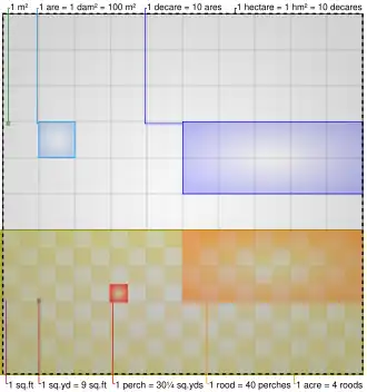Before the enactment of the metric system, many countries in Europe used their own official acres. In France, the traditional unit of area was the arpent carré, a measure based on the Roman system of land measurement. The acre was used only in Normandy (and neighbouring places outside its traditional borders), but its value varied greatly across Normandy, ranging from 3,632 to 9,725 square metres, with 8,172 square metres being the most frequent value. But inside the same pays of Normandy, for instance in pays de Caux, the farmers (still in the 20th century) made the difference between the grande acre (68 ares, 66 centiares) and the petite acre (56 to 65 ca).[52] The Normandy acre was usually divided in 4 vergées (roods) and 160 square perches, like the English acre.