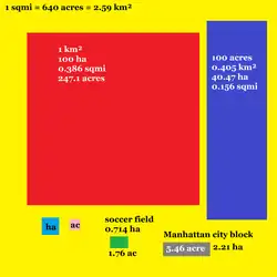 ![]() One hectare, with an acre represented as the lower white-and-yellow checkered region | |