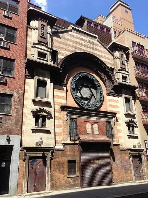 In 1903, the congregation purchased an old tenement building at 58-60 Rivington Street and engaged Roth to build a synagogue with the cornerstone laid on November 22, 1903. The inauguration of the synagogue occurred in early September 1904, with over 10,000 people present.[3] Falling into financial difficulty just a few years later, the congregation mortgaged the building to a developer, the Universal Building and Construction Co. By June 1907 the developer listed the synagogue for sale.[2]