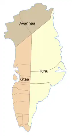 Greenland is divided into five municipalities and two unincorporated areas. The municipalities are Avannaata, Kujalleq, Qeqertalik, Qeqqata, and Sermersooq.[1][2] Northeast Greenland National Park is a huge unincorporated area that is outside the municipalities and larger than any of them. Pituffik Space Base is a small unincorporated enclave surrounded by the Avannaata municipality and administered by the United States Space Force.