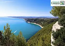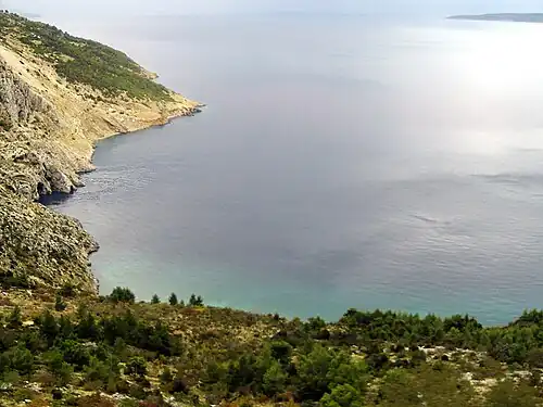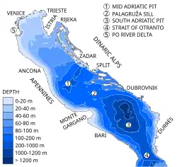 The Adriatic Sea's average depth is 259.5 metres (851 ft), and its maximum depth is 1,233 metres (4,045 ft); however, the North Adriatic basin rarely exceeds a depth of 100 metres (330 ft).[19] The North Adriatic basin, extending between Venice and Trieste towards a line connecting Ancona and Zadar, is only 15 metres (49 ft) deep at its northwestern end; it gradually deepens towards the southeast. It is the largest Mediterranean shelf and is simultaneously a dilution basin and a site of bottom water formation.[31] The Middle Adriatic basin is south of the Ancona–Zadar line, with the 270-metre (890 ft) deep Middle Adriatic Pit (also called the Pomo Depression or the Jabuka Pit). The 170-metre (560 ft) deep Palagruža Sill is south of the Middle Adriatic Pit, separating it from the 1,200-metre (3,900 ft) deep South Adriatic Pit and the Middle Adriatic basin from the South Adriatic Basin. Further on to the south, the sea floor rises to 780 metres (2,560 ft) to form the Otranto Sill at the boundary to the Ionian Sea. The South Adriatic Basin is similar in many respects to the Northern Ionian Sea, to which it is connected.[14] Transversely, the Adriatic Sea is also asymmetric: the Apennine peninsular coast is relatively smooth with very few islands and the Mount Conero and Gargano promontories as the only significant protrusions into the sea; in contrast, the Balkan peninsular coast is rugged with numerous islands, especially in Croatia. The coast's ruggedness is exacerbated by the Dinaric Alps' proximity to the coast, in contrast to the opposite (Italian) coast where the Apennine Mountains are further away from the shoreline.[32]