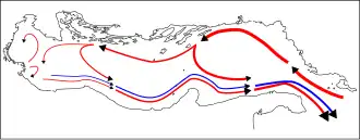 The coastal water dynamics are determined by the asymmetric coasts and the inflow of the Mediterranean seawater through the Straits of Otranto and further on along the eastern coast.[33] The smooth Italian coast (with very few protrusions and no major islands) allows the Western Adriatic Current, which is composed of the relatively freshwater mass on the surface and the cold and dense water mass at the bottom, to flow smoothly.[34] The coastal currents on the opposite shore are far more complex owing to the jagged shoreline, several large islands and the proximity of the Dinaric Alps to the shore. The last produces significant temperature variations between the sea and the hinterland, which leads to the creation of local jets.[32] The tidal movement is normally slight, usually remaining below 30 centimetres (12 in). The amphidromic point is at the mid-width east of Ancona.[35]