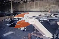 Under John F. Kennedy, presidential air travel entered the jet age.[41] Although he could use the Eisenhower-era jets for trips to Canada, France, Austria, and the United Kingdom, when he came into office, his primary aircraft domestically was still a prop powered Douglas VC-118A Liftmaster.[42] In October 1962, the modified long-range Boeing VC-137C Stratoliner SAM 26000, featuring livery designed by Loewy, was delivered and immediately became an important element of the Kennedy administration's brand.[34]