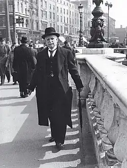 Byrne was elected as Lord Mayor of Dublin in 1930,[13][14] serving in the post for nine consecutive years.[15] When cycling or walking around the city he dispensed lollipops to children, who were often seen chasing him down the street. With a handshake and a few words for all, his eternal canvassing soon earned him the first of his nicknames: the Shaking Hand of Dublin.[6] Married with eight children, Byrne treated the people of Dublin as his second family.[16] Every morning he would find up to fifty people waiting for him in the Mansion House. None had appointments. All were met. Byrne answered 15,000 letters in his first year as Lord Mayor.[17] Many were from Dubliners looking for a job, a house, some advice or a reference. One morning in 1931 a journalist watched the Lord Mayor attend to his correspondence. Within an hour he accepted "seventeen invitations to public dinners, one invitation to a public entertainment and eight invitations to public functions." Then he dictated forty-three sympathetic letters to men and women looking for employment.[17] In 1937, children between the ages of eight and eleven years old were being sentenced to spend up to five years in Industrial Schools. Their crime was stealing a few apples from an orchard. When Byrne said such sentences were "savage," a judge responded with a defence of the Industrial School system, urging an end to "ridiculous Mansion House mummery."[18] Byrne stood firm: "For the punishment of trifling offences the home of the children is better than any institution."[19] In 1938, Byrne was favoured by the press for the presidency of Ireland, a ceremonial role created in the new Constitution, but he was outgunned by the political establishment.[20]