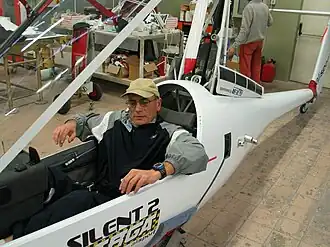 |   A Silent 2 Targa fuselage with a pilot trying out the cockpit | |