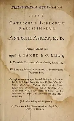 - ^ a b c d e f g "Bibliotheca Askveiana: Auction catalogue of Anthony Askew's library". Jeremy Norman's HistoryofScience.com. Archived from the original on 6 January 2014. Retrieved 15 June 2013.
