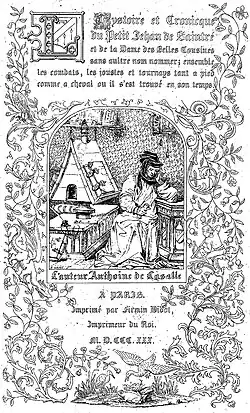 Antoine de la Sale (also la Salle, de Lasalle; 1385/86 – 1460/61) was a French courtier, educator and writer. He participated in a number of military campaigns in his youth and he only began writing when he had reached middle age, in the late 1430s. He lived in Italy at the time, but returned to France in the 1440s, where he acted as umpire in tournaments, and he wrote a treatise on the history of the knightly tournament in 1459. He became the tutor of the sons of Louis de Luxembourg, Count of Saint-Pol, to whom he dedicated a moral work in 1451. His most successful work was Little John of Saintré, written in 1456, when he was reaching the age of seventy.