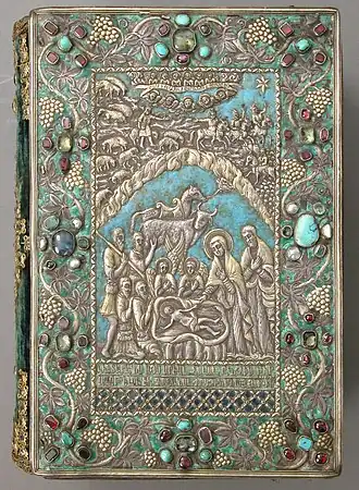 The gospel was created in two parts; the book itself dates to the 13th century, while the elaborate metalwork cover and accompanying adornments are attributable to the 17th century. The design used on the front plaque of the book, depicting the Nativity  and the Adoration of the Shepherds , is directly inspired by the work of Dutch woodcutter Christoffel van Sichem . The metalwork itself was produced in  Kayseri, Turkey .[ 1]