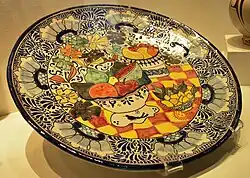 However, by the 1980s, there had been a further decline in the number of workshops until only four remained.[10] Talavera had been under pressure in the latter part of the 20th century because of competition from pottery made in other Mexican states, cheap imports and the lack of more modern and imaginative designs.[5] In the early 1990s, the Talavera de la Reina workshop began revitalizing the craft by inviting artists to work with their artisans to create new pieces and new decorative designs. Among the artists were Juan Soriano, Vicente Rojo Almazán, Javier Marín, Gustavo Pérez, Magali Lara and Francisco Toledo.[5][10][11] They did not change the ceramic processes, but added human forms, animals, other items and traditional images of flowers to the designs.[10]