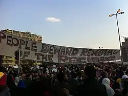 Ash-shaʻb yurīd isqāṭ an-niẓām (Arabic: الشعب يريد إسقاط النظام, lit. 'the people want to topple the regime', pronounced [æʃˈʃaʕb juˈriːd ʔɪsˈqɑːtˤ ænniˈðˤɑːm]) is a political slogan associated with the Arab Spring.[1][2] The slogan first emerged during the Tunisian Revolution.[3] The chant echoed at Avenue Habib Bourguiba in Tunis for weeks.[2] The slogan also became used frequently during the 2011 Egyptian revolution.[4][5][6][7] It was the most frequent slogan, both in graffiti and in chants in rallies, during the revolution in Egypt.[8]