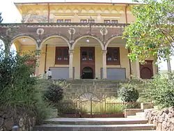 The building was erected on a hillside in Italian Asmara,[2] at the eastern end of the north side of today's Harriet Avenue (the old Corso Italia, later named Corso Mussolini and now the main road of Asmara) and at the corner of Beleza Street. This location made it possible to make the ascent to the Opera as a monumental staircase, which is circled on both sides by a shell-shaped fountain and a Renaissance-style loggia with Corinthian columns. The rest of the exterior of the building, especially the Beleza Street side facing, is castle-like, designed with battlements and towers. From the porch, it is possible to reach the foyer, which in turn gives access to the huge auditorium. This has, in addition to the parquet floor, three additional levels and can have 750 spectators. The stage is relatively small and does not have additional technical equipment.